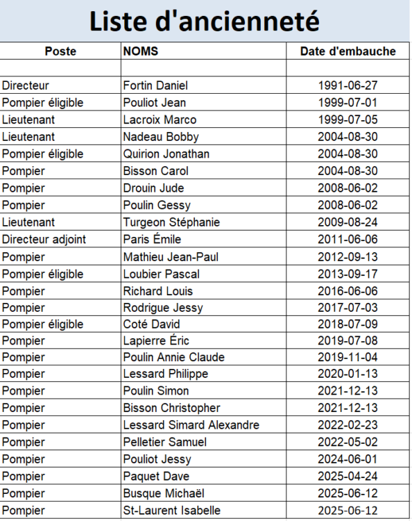 Pour toute information concernant le recrutement ou les exigences pour devenir pompier, veuillez communiquer avec la direction du Service de sécurité incendie :