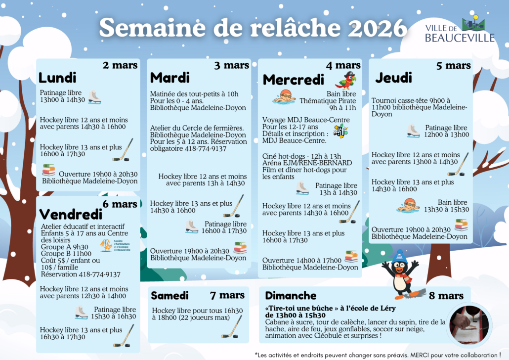 Cabane à sucre, TOUR DE CALÈCHE, lancer du sapin, TIRE DE LA HACHE, aire de feu, jeux gonflables, soccer sur neige, animation avec Cléobule et surprises !