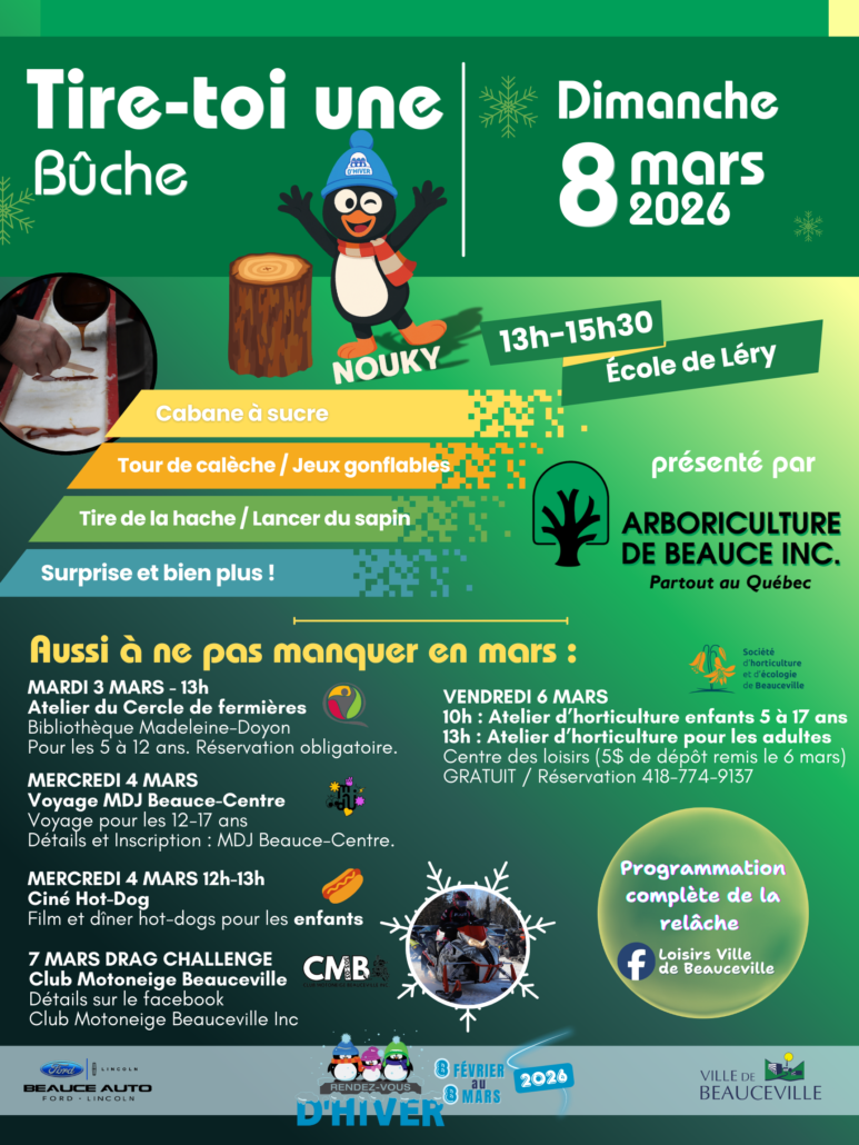 Cabane à sucre, TOUR DE CALÈCHE, lancer du sapin, TIRE DE LA HACHE, aire de feu, jeux gonflables, soccer sur neige, animation avec Cléobule et surprises !