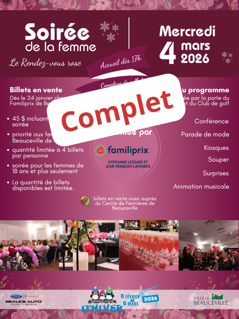 Billets en vente au Familiprix Beauceville le 24 janvier 2026 priorité aux femmes de Beauceville de 9h à 11h (avec preuve de résidence) et pour tous à partir de 11h ! / Quantité limitée à 4 billets par personne