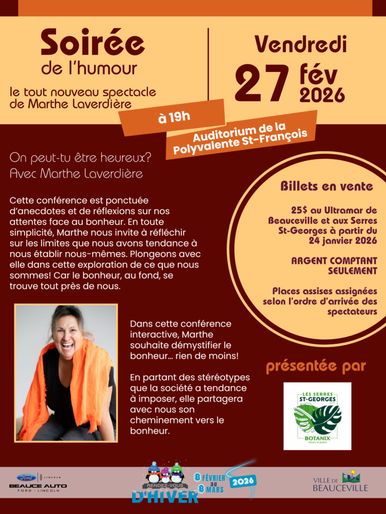 Billets en vente au coût de 25$ au Ultramar de Beauceville à partir du 24 janvier 2026. Places assises assignées selon l’ordre d’arrivée des spectateurs.